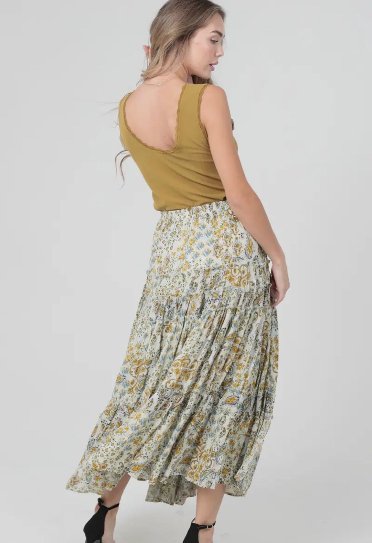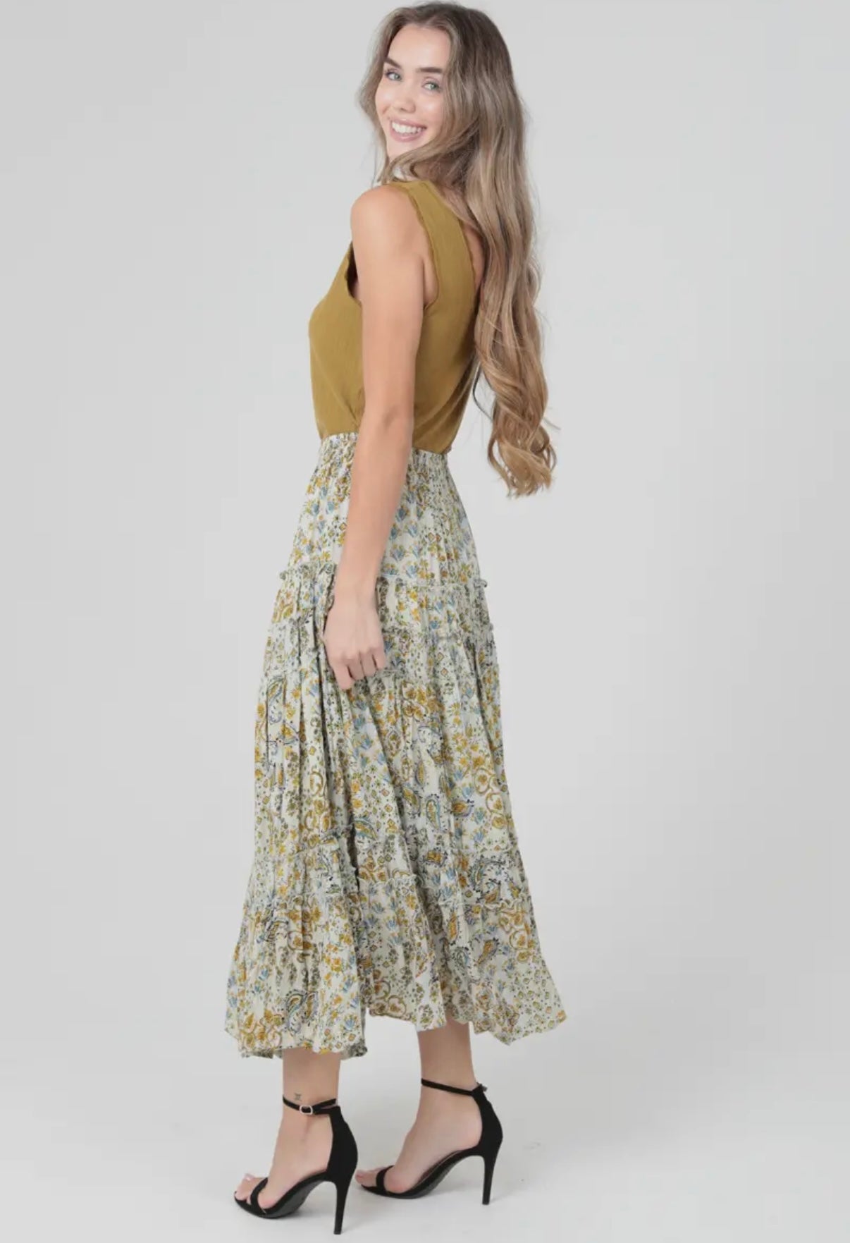 This flowy tiered maxi skirt features a soft elastic waistband and an all-over boho paisley print in sage, gold, and dusty blue tones — giving it that effortless Western-feminine vibe we love. Lightweight and easy to wear, it moves beautifully and transitions perfectly from summer to fall.