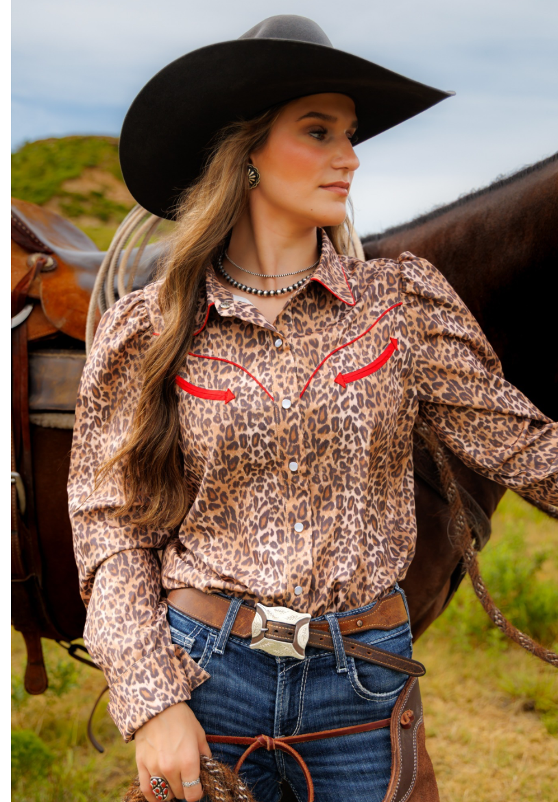 This leopard pearl snap is a modern cowgirl classic with just the right amount of sass. Designed with a flattering tailored fit and statement red arrow embroidery, it blends timeless Western tradition with a bold, feminine edge. Easy to dress up or wear ranch-casual, this is one of those pieces customers reach for again and again.